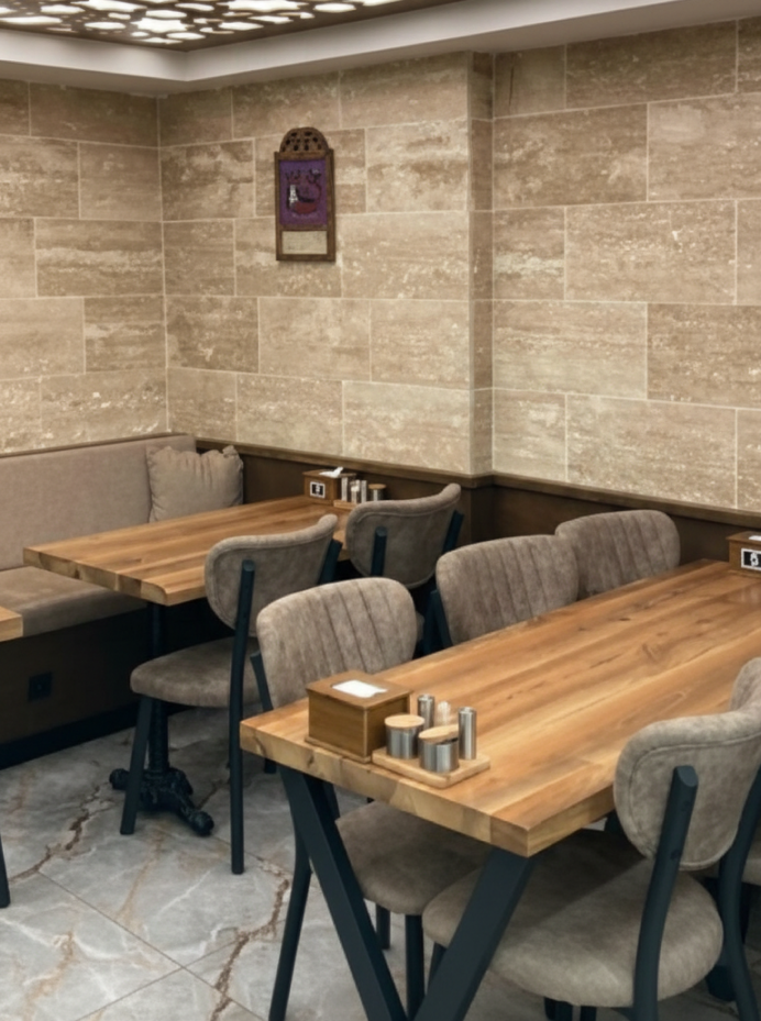 Mardin Et & Kebap Salonu projesinde, Anadolu’nun zengin mutfak kültürünü, mekanın mimarisine yansıtan sıcak ve otantik bir atmosfer kurguladık. Tasarımda, gelenekseli modern bir dille yorumlayarak; doğal taş duvar kaplamalarının yarattığı o sağlam ve tarihi dokuyu, ahşabın sıcaklığıyla harmanladık. Amaç sadece bir yemek alanı değil, misafirlerin kendilerini o kültürün içinde hissedecekleri, ferah, aydınlık ve konforlu bir “deneyim alanı” yaratmaktı.