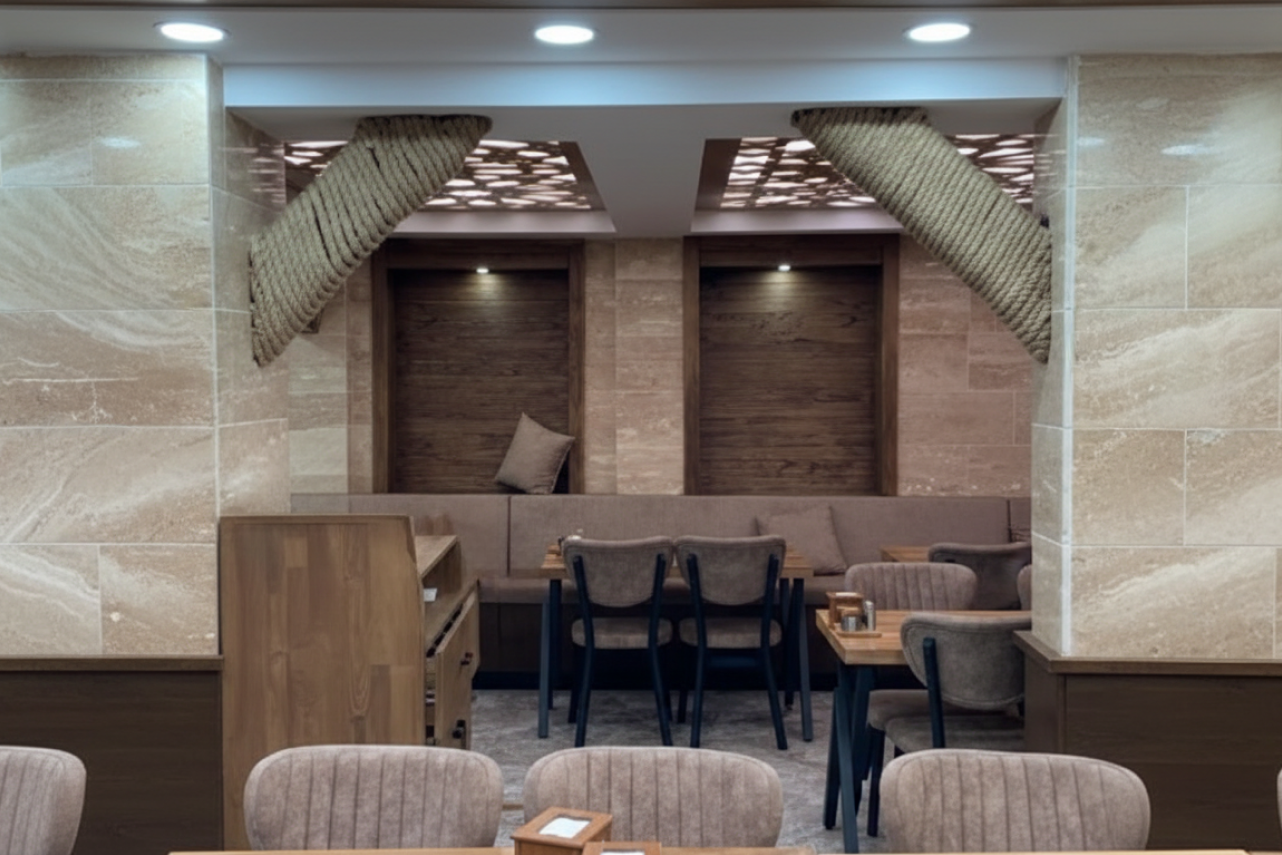 Wist İç Mimarlık olarak bu projede ince işçilik ve özel üretim yeteneklerimizi ön plana çıkardık. Mekanın en karakteristik özelliği olan tavanlardaki geometrik motifli CNC kesim ahşap paneller, atölyelerimizde özel olarak üretildi ve aydınlatma sistemiyle entegre edilerek mekana derinlik katıldı. Kolonlarda kullanılan halat sarım detayları ve mekana özel ölçülerde üretilen masif ahşap masalar, projenin “butik” kimliğini tamamlayan el işçiliği örnekleridir. Taş kaplama uygulamasından mobilya montajına kadar tüm süreç, tek elden, anahtar teslim bir titizlikle yönetildi.