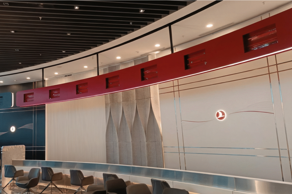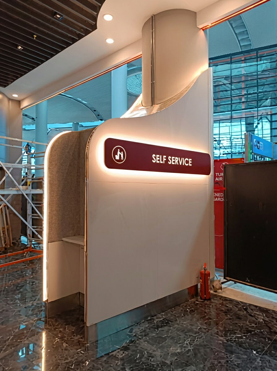 Proje, yolcu akış diyagramlarının analizi ve ergonomik yerleşim planlamasıyla başladı. Özellikle tavandaki kavisli ve ışıklı “kanopi” yapıları ve özel banko modülleri, atölyemizde CNC teknolojisi ve el işçiliği birleştirilerek üretildi.